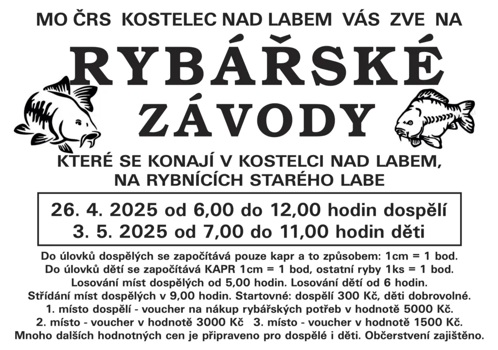 Srdečně Vás zveme na rybářské závody, které se konají v Kostelci nad Labem na rybnících Starého Labe. Připojte se k nám na den plný rybaření, přátelství a možnosti vyhrát atraktivní ceny.