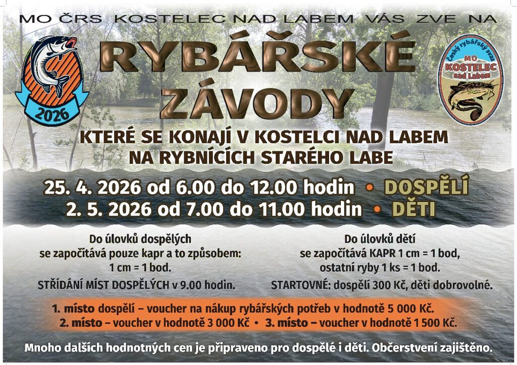 Srdečně Vás zveme na rybářské závody, které se konají v Kostelci nad Labem na rybnících Starého Labe. Připojte se k nám na den plný rybaření, přátelství a možnosti vyhrát atraktivní ceny.